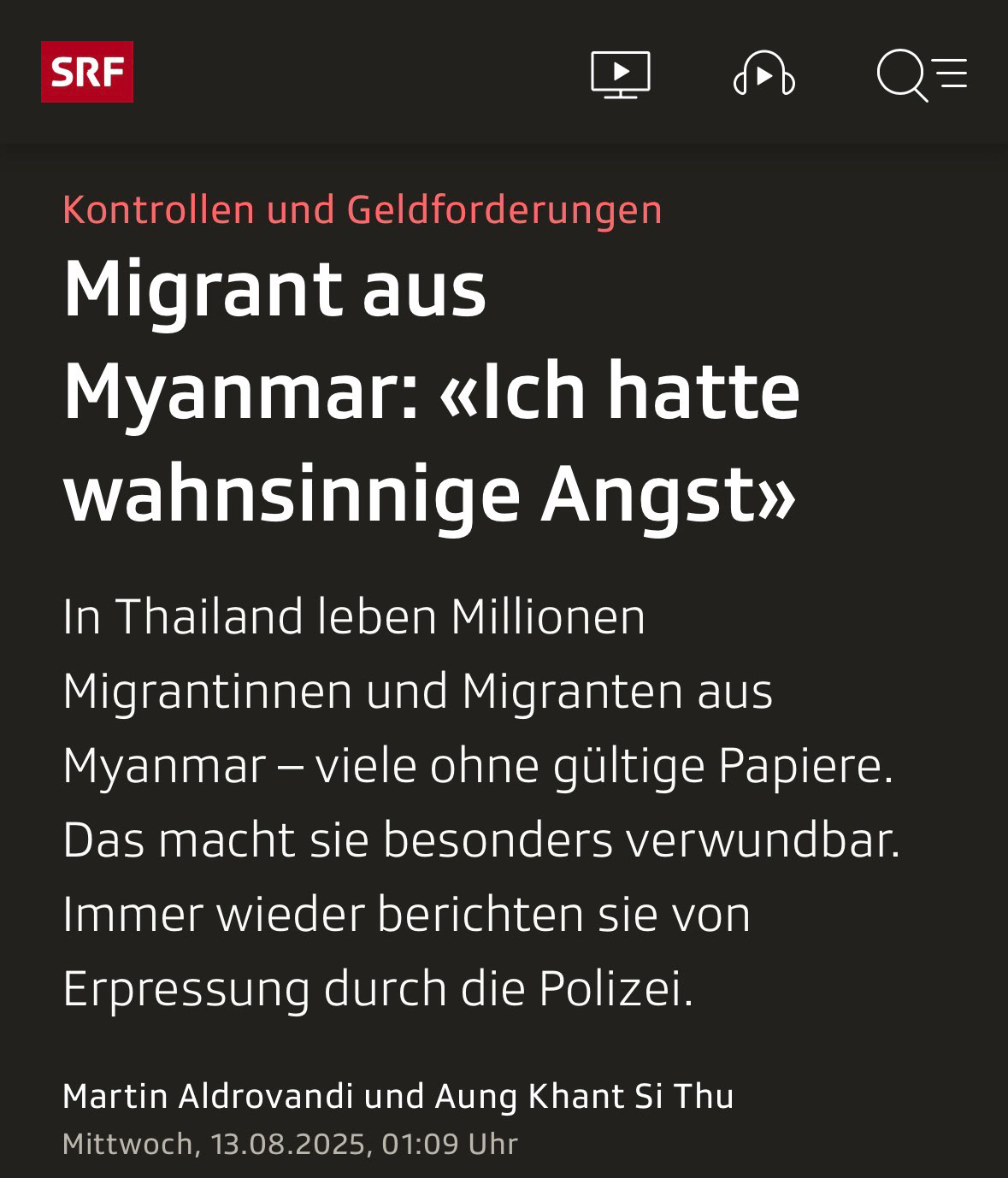 This feature for Swiss public broadcaster SRF focuses on the everyday fear faced by Myanmar migrants living in Thailand without legal status. As a field contributor, I supported the reporting with on-the-ground insights into police checks, extortion, and constant threats of arrest and deportation. The story shows how undocumented status leaves migrants exposed to abuse and corruption. Through personal testimonies, fear emerges as a permanent part of daily life. It highlights the human cost of survival in Thailand’s migration system.