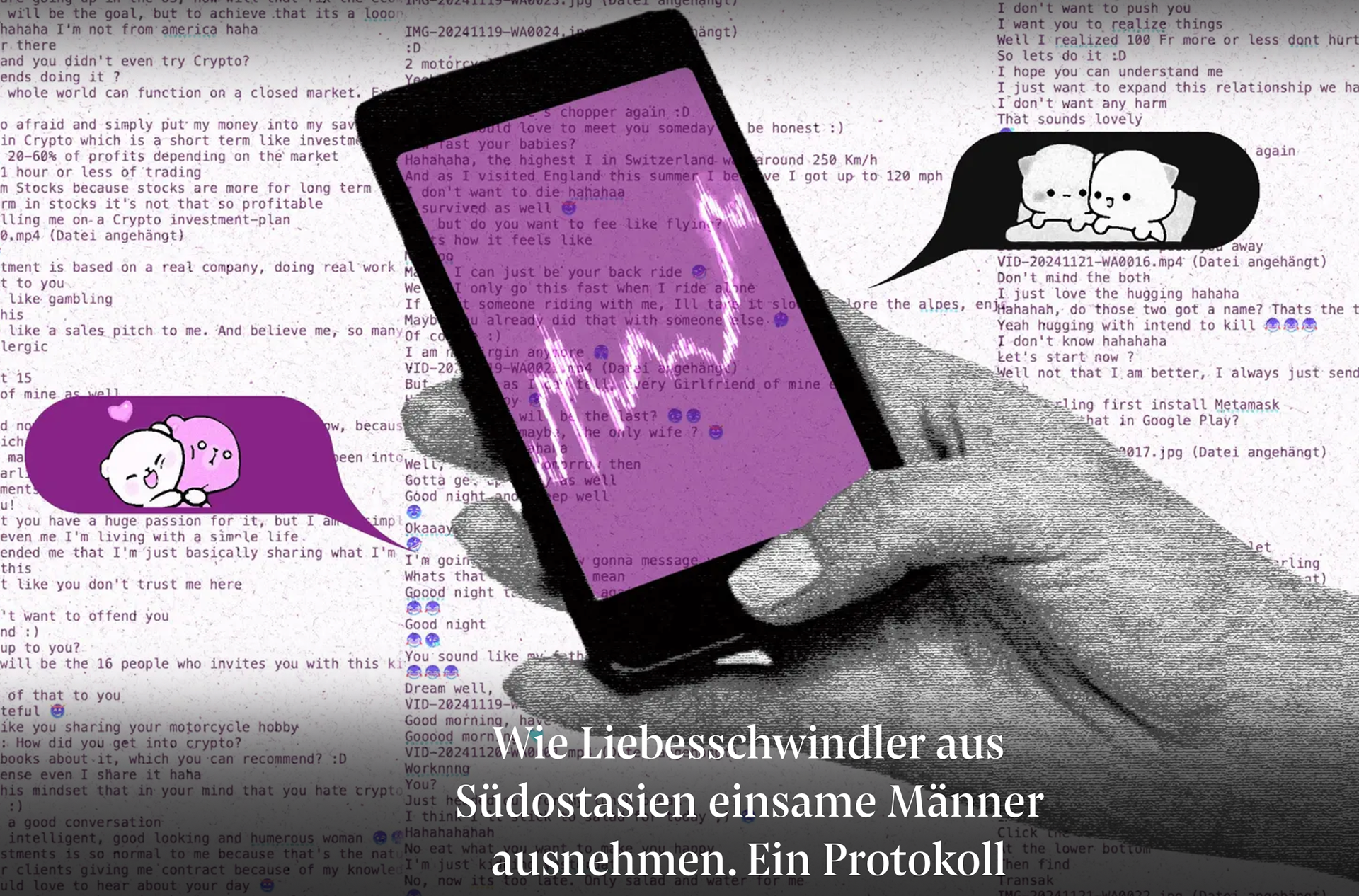 This investigative story for Swiss newspaper Neue Zürcher Zeitung (NZZ) examines the rise of romance scams operated from cyberfraud compounds across Southeast Asia. The report follows the digital manipulation of victims — often older men — who are lured into fake online relationships and financially exploited.